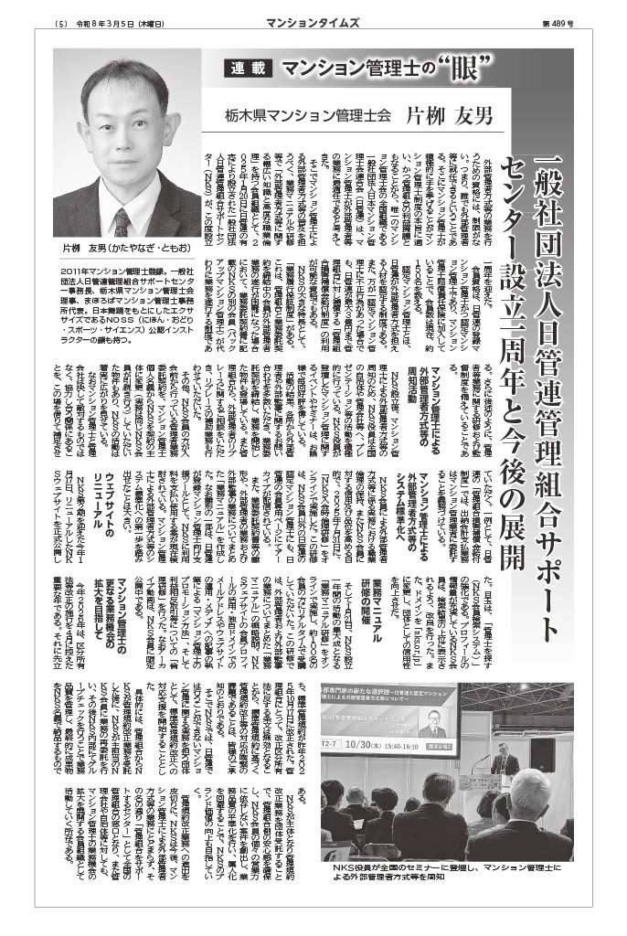 不動産経済研究所発行『マンションタイムズ』2026年3月号に掲載されました 2026年3月5日 最終更新日時 : 2026年3月13日 片栁 友男 株式会社不動産経済研究所が発行する月刊専門紙『マンションタイムズ』第489号(2026年3月5日発行)の連載記事「マンション管理士の“眼”」に、片栁友男事務長の執筆による記事「一般社団法人日管連管理組合サポートセンター設立一周年と今後の展開」が掲載されました。 ※画像をクリックすると、PDFファイルが開きます。 FacebookXBlueskyHatenaCopy